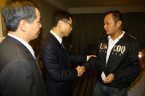 海基會副董事長高孔廉(中)3日前往臺北縣深坑福容飯店,慰問蘇花坍方意外的大陸游客家屬。“中央社”圖