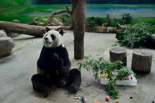 今年,臺北市動物園的保育員用紅蘿卜、鳳梨、竹子、葡萄等食材,為“團團”“圓圓”各做1個生日蛋糕,并用甘蔗做成表示11歲的“蠟燭”。“圓圓”的生日蛋糕有2個紅蘿卜做的愛心型冰塊,“團團”的蛋糕則有2個用冰塊、西瓜皮做成的大熊貓造型冰雕。