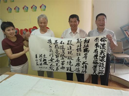 7月30日上午,參訪團(tuán)在鎮(zhèn)江市民政局、市臺(tái)辦及京口區(qū)領(lǐng)導(dǎo)的陪同下,頂著烈日酷暑,邊走邊聽,邊看邊問(wèn),沿途搜要資料、拍照、錄像,并不時(shí)豎起大拇指點(diǎn)贊。在社區(qū)留守兒童活動(dòng)室,孩子們聽說(shuō)是臺(tái)灣客人來(lái)了,紛紛把自制紙扇題上祝福的話語(yǔ)送給客人;在茶藝培訓(xùn)中心,老師正在為退休老人示范泡茶技藝,客人們不僅圍上來(lái)觀看,還接過(guò)老師送上的小杯品茗;來(lái)到多功能活動(dòng)大廳,社區(qū)戲劇愛好者正在練唱京劇,大家便和著節(jié)拍,搖著手中的紙扇,不時(shí)拍手叫好;走進(jìn)書畫練習(xí)室,一位老者正在揮毫,見有客人進(jìn)來(lái),忙放下手中的筆迎上來(lái)招呼。團(tuán)長(zhǎng)李仁林是一個(gè)書法愛好者,看著案頭現(xiàn)成的紙筆,情不自禁地寫下了:“你濃我濃鎮(zhèn)江好,有來(lái)有往瑞芳美”。接著把筆遞給身旁的瑞芳區(qū)前區(qū)長(zhǎng)簡(jiǎn)華祥先生:“你也露一手”。簡(jiǎn)先生稍思片刻,也寫下兩句:相融兩岸人情好,新北鎮(zhèn)江永嬋娟。在一片叫好聲中,簡(jiǎn)先生的筆又讓到了社區(qū)老人朱正良手中,朱老先生不加思索,一氣呵成寫下了“根連根枝挽枝,不懼凄風(fēng)苦雨,高風(fēng)亮節(jié)兩兄弟,攜手前行無(wú)人欺”。這下,現(xiàn)場(chǎng)的掌聲更長(zhǎng)久更熱烈。緊接著,這幅由兩岸3人合作的書法作品送到了社區(qū)主任手中。“這是珍貴的墨寶,我們一定好好珍藏”,社區(qū)主任既高興又激動(dòng),與三位藝人合影留念。