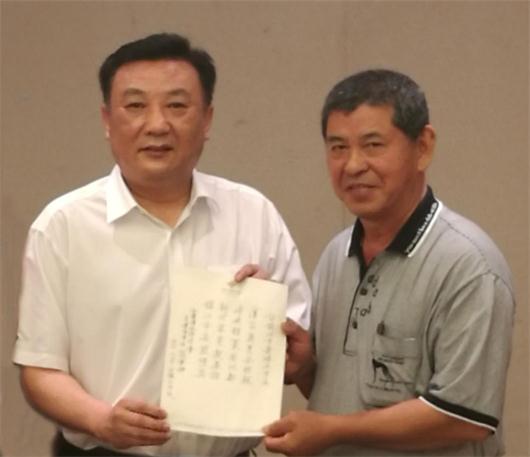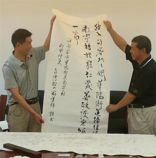 圖為前新北市瑞芳區(qū)區(qū)長(zhǎng)(右)賦詩(shī)贈(zèng)予句容市華陽(yáng)街道南亭村。