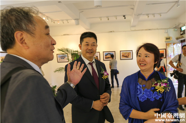 臺灣攝影家交流協(xié)會理事長林再生(左)、寧夏回族自治區(qū)攝影家協(xié)會名譽主席彭生選(中)與中國臺灣網(wǎng)總經理兼海峽兩岸互聯(lián)網(wǎng)交流委員會秘書長劉曉輝(右)觀展(中國臺灣網(wǎng) 李岳 攝)