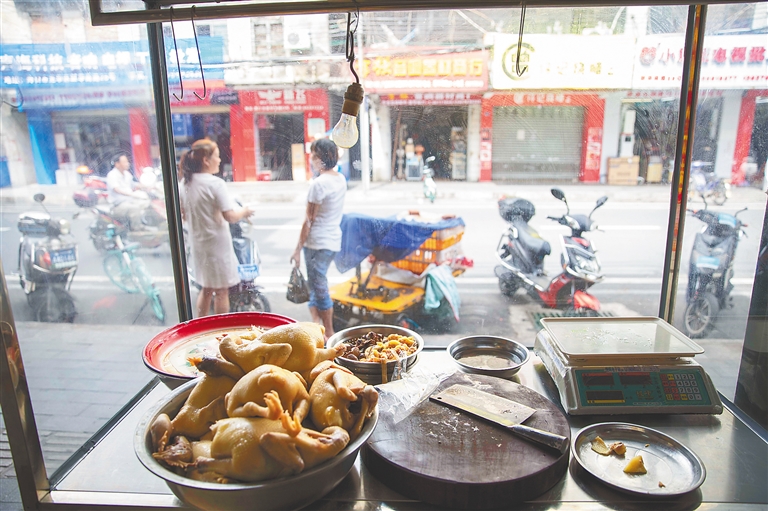 “我們已經(jīng)在這里做了40多年了,算是干了一輩子了。”小店的玻璃柜子里,展示著還冒著熱氣的白斬雞——黃澄澄的雞皮色澤油亮,勾人食欲。店主蘭姨笑容滿面,時常和食客閑聊幾句。