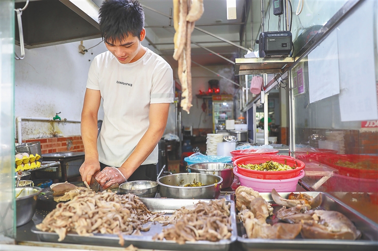 在義龍西路和義龍路交叉口的位置,一家開了近20年的鹽焗雞老店,每逢飯點都座無虛席。“過去這里的老居民很多,我們的生意比現(xiàn)在還好,很多人排隊打包。”鹽焗雞店的符老板說,近些年來,越來越多的年輕人走出老街,到外面買房生活,不過好在義龍路的美食名氣在外,有不少食客慕名而來,生意還比較好做。