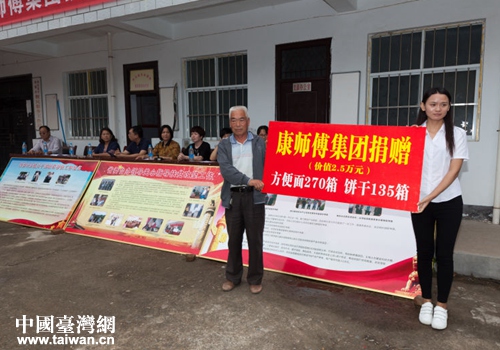 中國臺灣網(wǎng)9月18日洛寧訊 9月13日,康師傅集團到洛陽市洛寧縣西山底鄉(xiāng)孫洞村扶貧捐助,為孫洞村135戶貧困戶捐贈了價值2.5萬余元的方便面、面包等食品,送去中秋祝福。省臺辦副主任崔興莉、洛寧縣委統(tǒng)戰(zhàn)部長張根苗、康師傅集團方便面事業(yè)工會主席竹新南等出席捐贈儀式并發(fā)言。