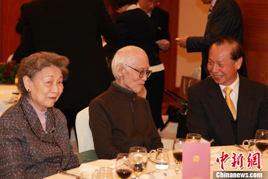 圖為著名詩人余光中(左二)及夫人(左一)與臺灣親民黨秘書長秦金生(右一)在晚宴上交流。中新社發 符永康 攝