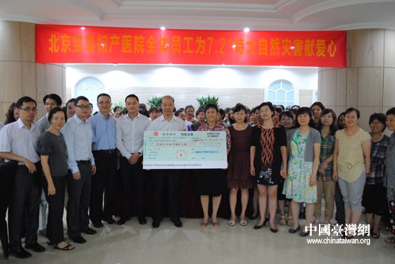 繼北京市臺辦和北京臺協(xié)組織在京臺資企業(yè)昨天向房山區(qū)河北鎮(zhèn)“7·21”暴雨受災(zāi)群眾捐贈一批物資之后,今天上午,北京首家與臺灣合資的婦產(chǎn)醫(yī)療機構(gòu)——北京寶島婦產(chǎn)醫(yī)院也組織全體員工共同發(fā)起了“北京寶島婦產(chǎn)醫(yī)院筑愛北京”獻(xiàn)愛心捐款活動。