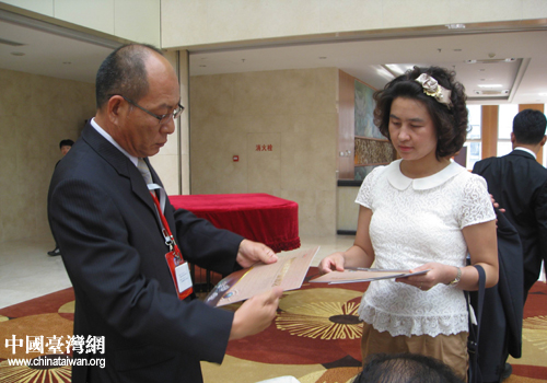 凌源市相關人員向臺商發放材料,積極宣傳凌源。(圖片來源:朝陽市臺辦)