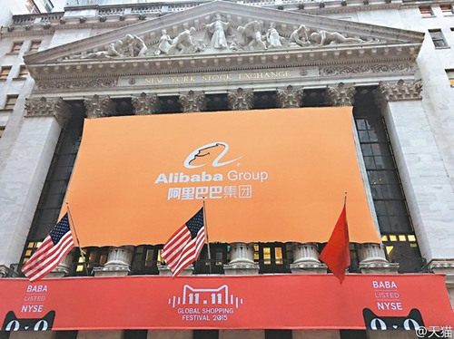 美東時間11月11日早晨,美國紐約交易所外墻掛起橙色阿里巴巴標志和紅色天貓橫幅,向雙十一全球網購節致意。 圖/取自天貓微博