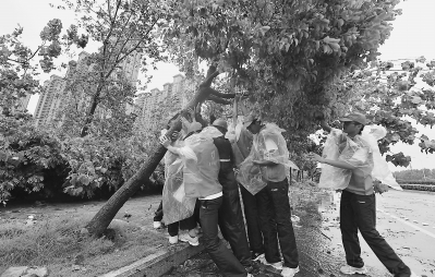 兩岸大學生攜手把路邊被臺風刮倒的樹扶正。