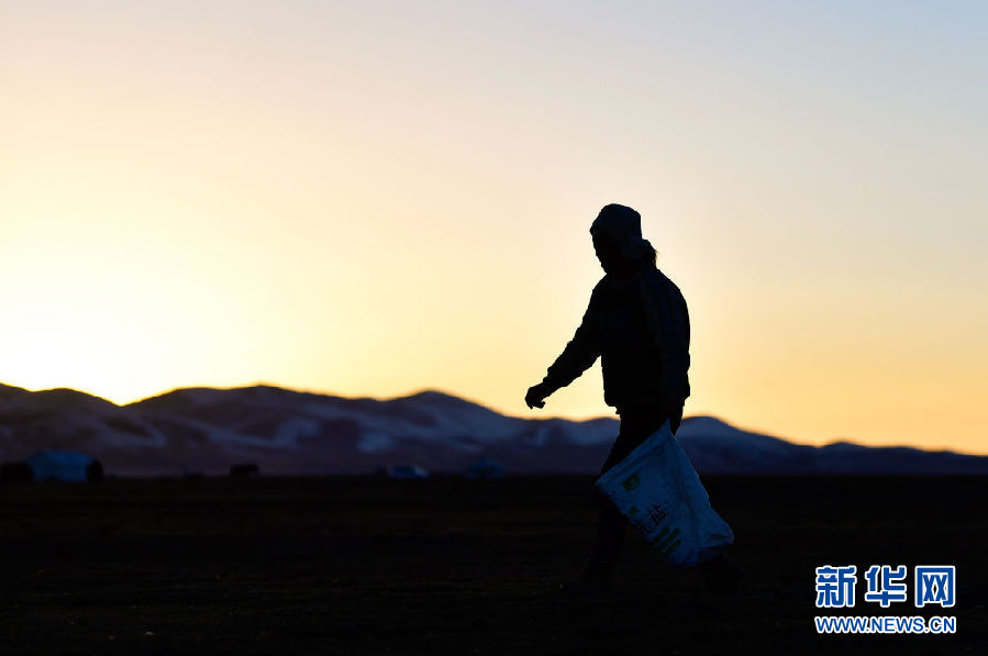 10月28日,在青海省玉樹藏族自治州稱多縣境內的嘉塘草原上,生態管護員扎西才文在撿拾垃圾。新華社記者 張龍 攝