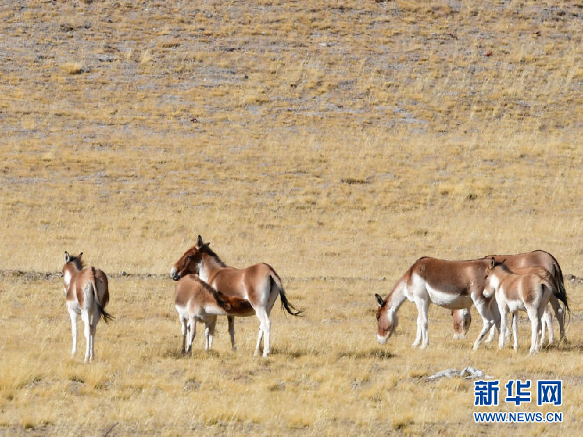 10月30日,在青海省果洛藏族自治州瑪多縣境內,一群藏野驢在覓食。新華社記者 張龍 攝