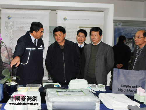 劉俊杰一行參觀什邡大愛感恩環(huán)保科技有限公司環(huán)保產(chǎn)品。(圖片來源:四川省臺辦)