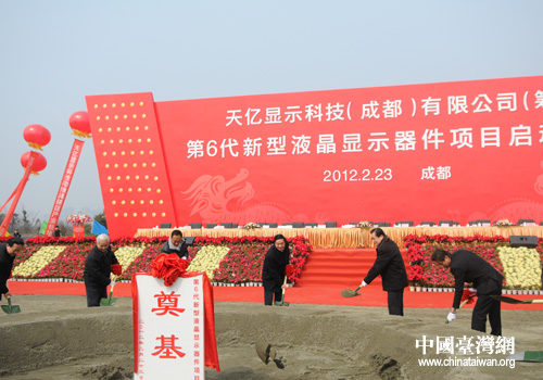 啟動(dòng)儀式在成都高新區(qū)西區(qū)產(chǎn)業(yè)基地舉行。啟動(dòng)儀式上,劉奇葆、蔣巨峰、陶武先、李春城等省領(lǐng)導(dǎo)以及富士康集團(tuán)總裁郭臺(tái)銘和天億顯示科技(成都)有限公司負(fù)責(zé)人共同為項(xiàng)目奠基培土。