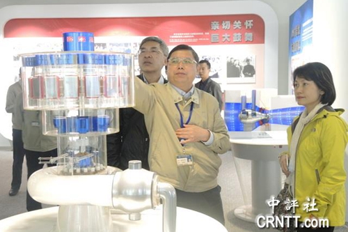 東方電機(jī)公司副總經(jīng)理兼教授級(jí)高級(jí)工程師曾小平替采訪團(tuán)解說(shuō)發(fā)電原理。(中評(píng)社 戴祺修攝)