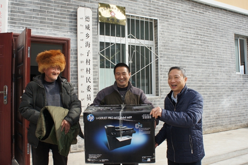 四川省臺(tái)辦主任周敏謙(右)代表省臺(tái)辦向海子村活動(dòng)中心送上文印傳真一體機(jī)