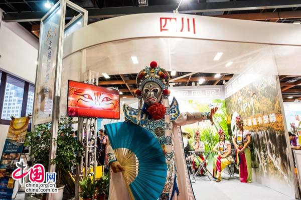 在四川展臺,川臺兩地旅行社雙方溝通氣氛融洽,臺北民眾也對四川旅游表現出了強烈興趣,不斷前來咨詢和領取各類四川旅游宣傳資料,現場互動熱烈,展臺上擺放的熊貓玩偶也受到了大家的喜愛。現場穿插的川劇變臉、特色茶藝、川劇俏花旦表演令專業觀眾駐足欣賞并拍手稱贊,萌萌的熊貓人偶也賺足人氣,前來展臺要求與熊貓人偶合影的觀眾絡繹不絕。