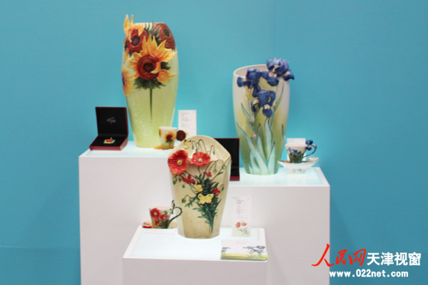 梵高的向日葵一朵朵綻放在陶瓷花瓶上,大朵的牡丹映襯著中國紅瓷器套件,在法藍(lán)瓷展區(qū)里,件件別具東方韻味的優(yōu)雅器具吸引市民駐足觀看,景德鎮(zhèn)法藍(lán)瓷實(shí)業(yè)有限公司總裁助理梁振說,開展兩天以來至少有4000人參觀該展區(qū)并有不少人購買。