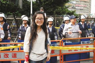 到了臺灣,街頭民主一定要見習(xí)一下的啦!抗議的紅色布條在右手綁成手環(huán),來自南京的黃艷梅,美美地跟臺灣警察合影留念一下吧。陳柏亨攝影