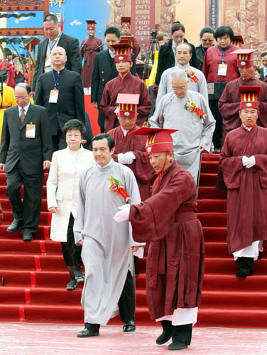 穿上灰色長袍的馬英九致詞時,分享他讀古籍的心得。他認(rèn)為,臺灣要做中華文化的領(lǐng)航者,并已創(chuàng)造出具有臺灣特色的中華文化。