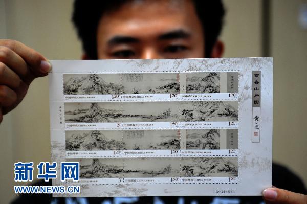 這是2010年《富春山居圖》成畫660周年之際首發(fā)的《富春山居圖》特種郵票。該郵票以《富春山居圖》整幅畫卷為藍本(5月11日攝)。當日,元代黃公望《富春山居圖》(剩山圖)在浙江省博物館點交啟運,將經由北京后赴臺,于6月1日在“山水合壁——黃公望與《富春山居圖》特展”上,與臺北故宮博物院所藏《富春山居圖》(無用師卷)聯合展出。這將是該畫作兩部分在分別360年后首次實現合璧。新華社記者 韓傳號 攝