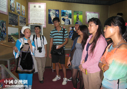 中國(guó)臺(tái)灣網(wǎng)7月19日三都消息 日前,2012年臺(tái)灣青年千人夏令營(yíng)貴州分營(yíng)踏上三都水族自治縣。走進(jìn)水族民族博物館領(lǐng)略神秘的水族文化。三都是全國(guó)唯一的水族自治縣,水族人口占全縣人口的80%,水族有自己的文字和語言。