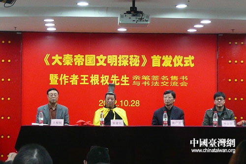 中國臺灣網(wǎng)10月28日北京消息 2012年10月28日上午,《大秦帝國文明探秘》新書發(fā)布會在北京王府井新華書店舉行。在《大秦帝國文明探秘》一書中作者王根權用全新的思路帶我們去探秘大秦帝國的文明和解讀秦王朝那些驚天大事。此書是王根權先生歷經(jīng)十年發(fā)掘、考證和研究后寫成的作品。