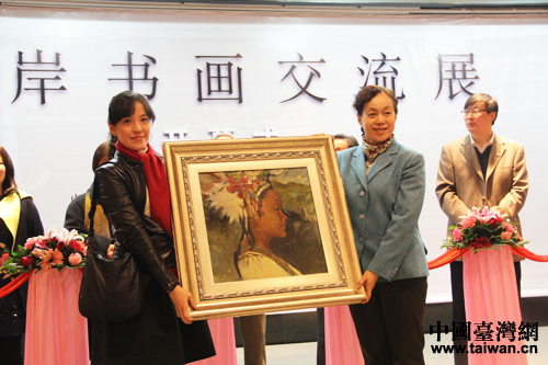 臺(tái)灣書畫界代表馬曉英向北京市臺(tái)聯(lián)贈(zèng)送禮物。(中國臺(tái)灣網(wǎng) 楊永青 攝)