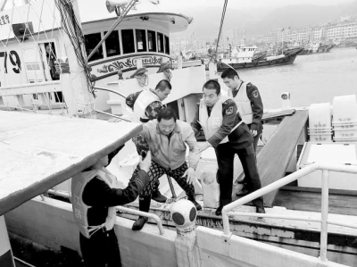 8時15分,兩岸救援船只到達事發海域。此時海上風力達8級,浪高約3米,加上該海域海況復雜,救援船只多次靠幫均被海浪打散,現場救援十分困難。見此情況,邊防官兵與救援人員經過緊急商議,決定以拋纜繩固定船只的方式施救,通過多次努力,救援船才與遇險漁船搭靠成功。隨后,兩岸救援人員一起將“閩連漁61335”號10名船員順利轉移至臺輪“順利泰”上,并將船上漁貨搬運至其余救援船只,以減輕遇險船只的船體負重,同時迅速抽調3臺大馬力水泵將其船艙內灌入的海水抽出。