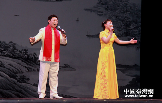 4月8日晚,由北京市文聯、北京市臺辦、北京市新聞辦主辦的第十四屆京味文化之旅首場演出在臺中市中興堂舉辦。圖為歌曲對唱《老北京叫賣聲》。(中國臺灣網 高斯斯 攝)