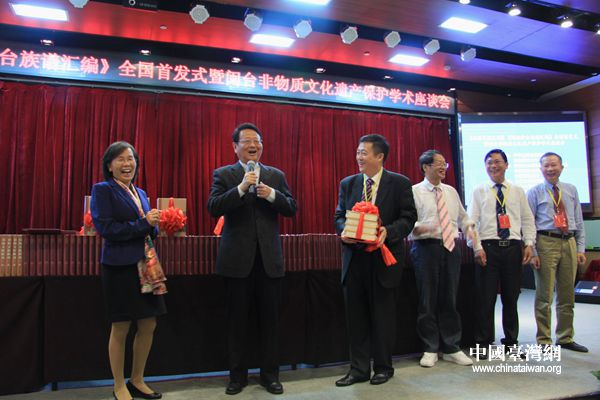 《臺(tái)海文獻(xiàn)匯刊》、《閩南涉臺(tái)族譜匯編》29日在京首發(fā),圖為全國臺(tái)聯(lián)會(huì)長汪毅夫接受閩南師范大學(xué)贈(zèng)書(中國臺(tái)灣網(wǎng) 李徽 攝)