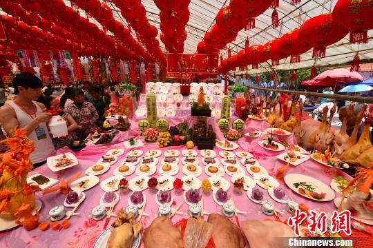 “每年春季采茶季節都恰逢媽祖誕辰紀念日,雖然不能回臺灣,但這里的祭祀活動每年都與臺灣一樣熱鬧!敝x東慶說,除了掛滿棚頂的大紅燈籠外,一大早,永福眾人就以村組為陣,在媽祖廟前擺起了上百桌供品,祈求神明庇佑大家平安幸福,風調雨順。