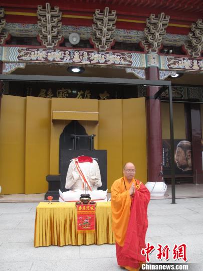 來自河北幽居寺的北齊時期釋迦牟尼像佛身21日下午在佛光山大雄寶殿前開箱,佛光山住持心保和尚帶領佛光山僧眾舉行了莊嚴的迎請儀式!荨z