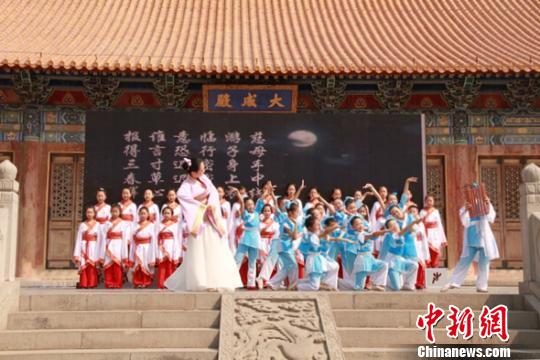 “和諧中華”第六屆海峽兩岸經(jīng)典文化推廣會演開幕式現(xiàn)場濟(jì)南府學(xué)文廟大成殿,圖為濟(jì)南市小學(xué)生表演《游子吟》!≡鴿崱z