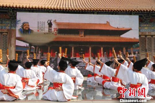 濟(jì)南市小學(xué)生當(dāng)日還展演了傳統(tǒng)禮義及儒家經(jīng)典文藝節(jié)目:手持弓箭,表演射禮;翩翩起舞,演繹《游子吟》;宋服竹簡,朗誦儒家典籍《大學(xué)》名句……形式多樣的展演立體化地呈現(xiàn)了中華經(jīng)典文化故事。