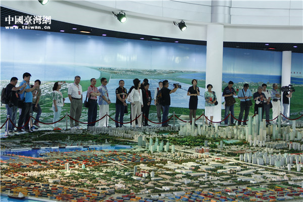 臺(tái)灣中南部媒體訪(fǎng)問(wèn)團(tuán)采訪(fǎng)天津?yàn)I海新區(qū),圖為天津?yàn)I海新區(qū)規(guī)劃展覽館內(nèi)合影。(中國(guó)臺(tái)灣網(wǎng) 段雯婷 攝)