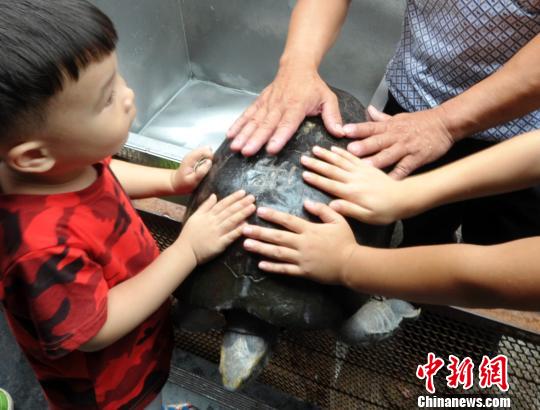 孩子們在大人的指引下輕輕地撫摸“靈龜”龜背。 余丹 攝