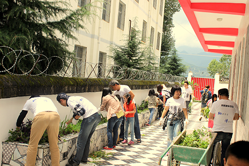 愛心人士為學(xué)校修整花圃。
