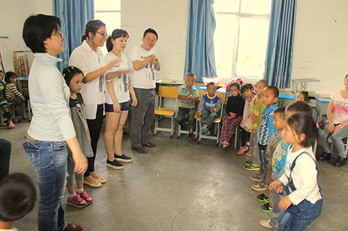 愛心人士與學(xué)校幼兒園小朋友做游戲。