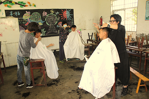 愛心人士為學(xué)校學(xué)生理發(fā)。
