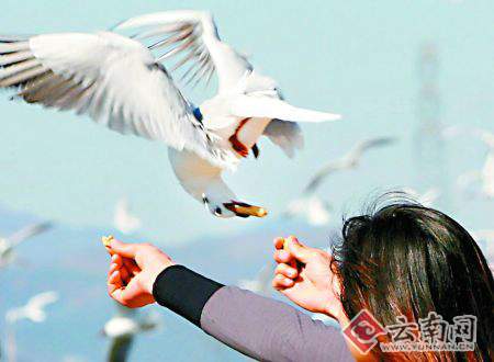 昨日(1月3日)上午,記者來到昆明市翠湖公園,在九曲橋前看到前來觀鷗、喂鷗的市民格外多。游客們買來鷗糧、面包拋喂海鷗,而海鷗則近距離與游客接觸相歡,一派其樂融融的景象。