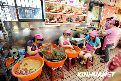 5月20日,臺北市南門市場的商販們在忙著包粽子。端午節臨近,在臺北市南門市場,廣東口味的裹蒸粽、江浙口味的湖州粽、臺灣口味的南粽和北粽紛紛上市。新華社發(吳景騰 攝)