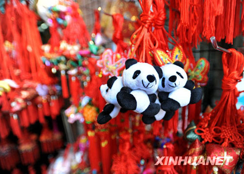 5月19日在臺北市街頭拍攝的熊貓造型的端午香包。端午節臨近,各式各樣的香包在臺北上市,熊貓造型的香包尤其受到孩子們喜愛。新華社發(吳景騰 攝)