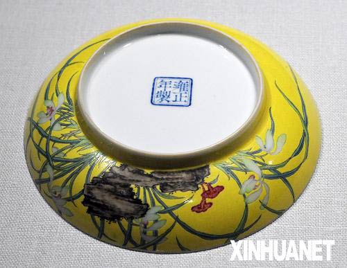 這是10月6日在臺北拍攝的清雍正瓷胎畫琺瑯黃地芝蘭圖盤。新華社發(吳景騰 攝)
