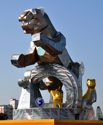 中新網(wǎng)2月24日電 據(jù)“中央社”報(bào)道,2010臺(tái)灣燈會(huì)主燈“福臨寶島”23日完成。亮灰色大虎加上2組金色Q版幼虎燈,不僅姿態(tài)宏偉,兼具歡樂(lè)溫馨氣氛,整體造型宏偉富巧思。