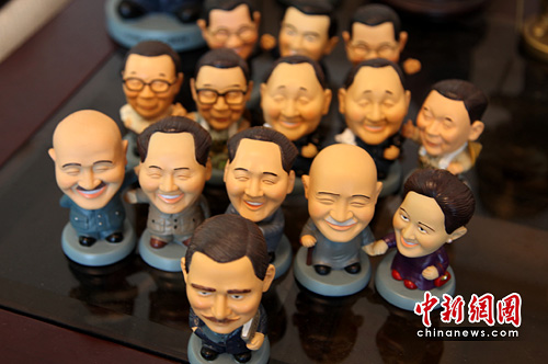 隨著大陸民眾赴臺旅游人數激增,臺灣業者推出兩岸領導人公仔,大受歡迎。圖為臺北一位人士收藏的孫中山、毛澤東、蔣介石、鄧小平、蔣經國、馬英九、蕭萬長等個性公仔,個個造型講究,笑容可掬。中新社發 董會峰 攝