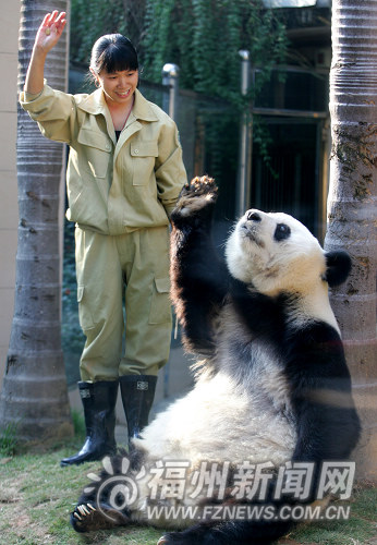 10日下午,“巴斯”與“五羊”的擁抱訓練引得游客紛紛駐足觀看,“巴斯”一會兒拍拍“五羊”,一會兒親吻“五羊”,游客對“巴斯”的可愛表現贊嘆不已。(福州日報記者 祁正華/文 俞松/攝)