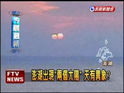 據報道,臺灣網絡近日瘋傳一組澎湖“兩個太陽”的奇異照片。照片當中,好像真的出現兩個太陽,相偎相依,網友稱之為奇特的“太陽雙胞胎”景象。有網友表示,“莫非太陽也有分身術,難道天真有異象嗎?”