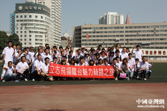 參加“隴臺百名中學生魅力絲路體驗之旅”活動的兩地中學生在蘭州一中體育場合影。(中國臺灣網(wǎng) 宿靜 攝)