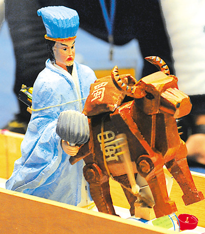 四川成都紅磚西路小學學生制作的“諸葛亮木牛流馬”在參加直線競賽。