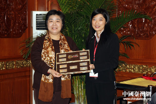 中國(guó)宋慶齡基金會(huì)聯(lián)絡(luò)部副部長(zhǎng)宋建(左)和臺(tái)灣十杰基金會(huì)人員互贈(zèng)禮物